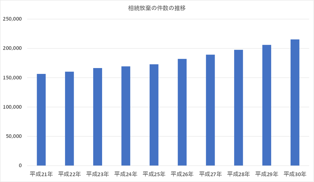 実は相続放棄を選ぶ人は年々増加しています。だからこそ、終活の際に可能性があるのであれば、考えておいた方が良いでしょう。司法統計によると、相続放棄の受理件数は2019年に22万5415件と5年前に比べて2割強増えました。引き継ぐ負債が資産を上回る場合に放棄を選び、多くが借金の負担を避けるのが目的と見られますが、最近は不動産を理由に放棄する例が増えているようです。