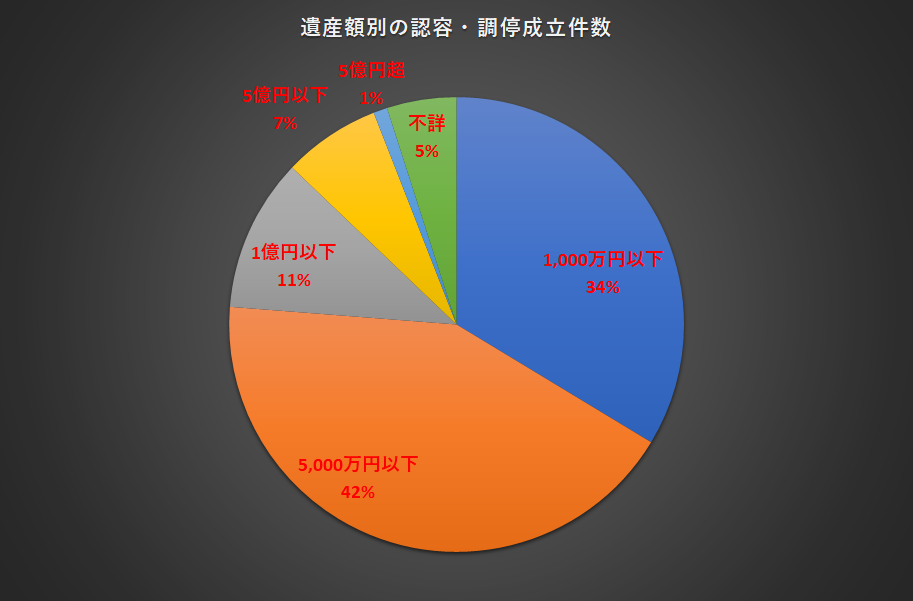 しかし、実際には相続財産が少ない方が争いになっているのです。全国の家庭裁判所に持ち込まれた遺産分割事件のうち、遺産額別の認容・調停成立件数(令和元年度)をみると、遺産額が1,000万円以下の事件が全体の34%、5,000万円以下が44%で、実に76%が遺産額5,000万円以下の事件となっています。
