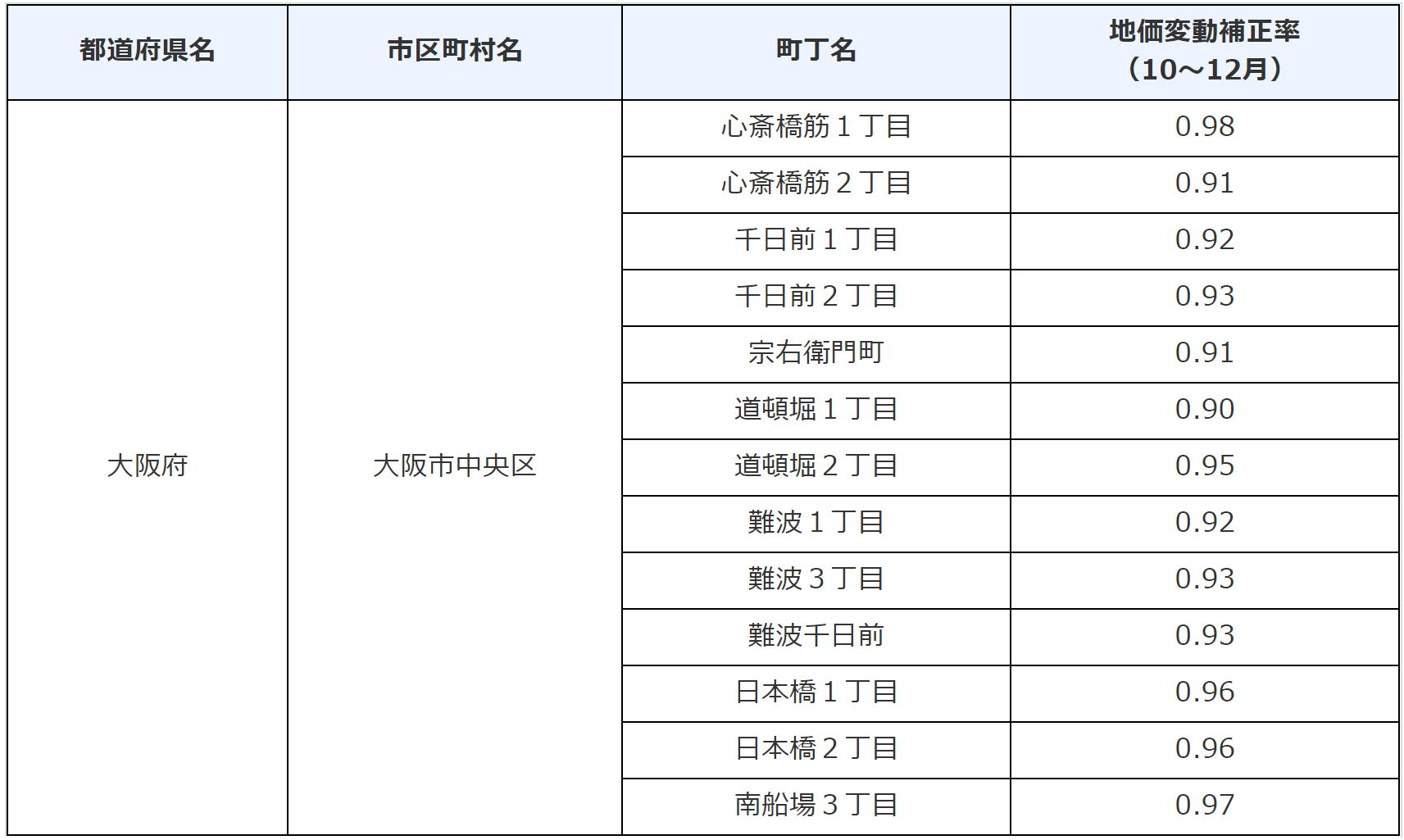 令和2年10~12月分の地価変動補正率は以下の通りです。