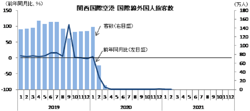 ○関西国際空港 国際線外国人旅客数【前年同月比で13ヶ月連続の減少。】