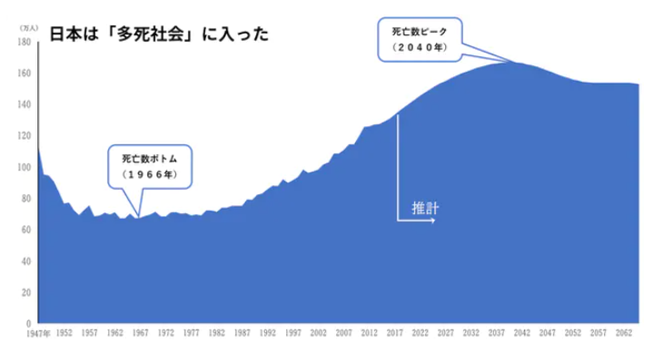 終活が広がった背景には、年間130万人以上も亡くなる多死社会の到来があるのです。死亡者数が底辺だったのは、1966年で年間約67万人でしたが、現在の死亡者数は約138万人程度です。これが2040年に迎えるピークでは約167万人に増える見通しです。