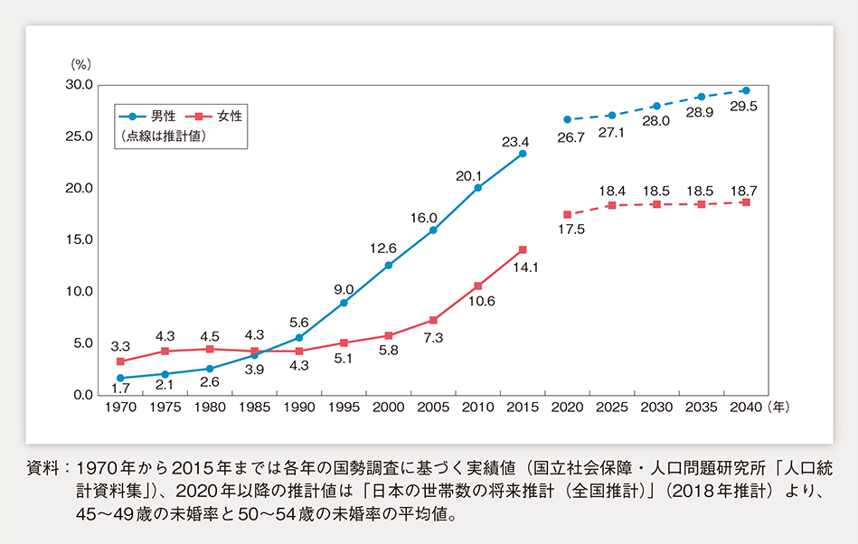 生涯未婚の人も増えています。50歳時に未婚だった人は将来的に結婚する予定がないとみなし、「生涯未婚率」呼ばれます。直近では男性が23.4%、女性が14.1%です。男性4人に1人が生涯未婚ということになります。