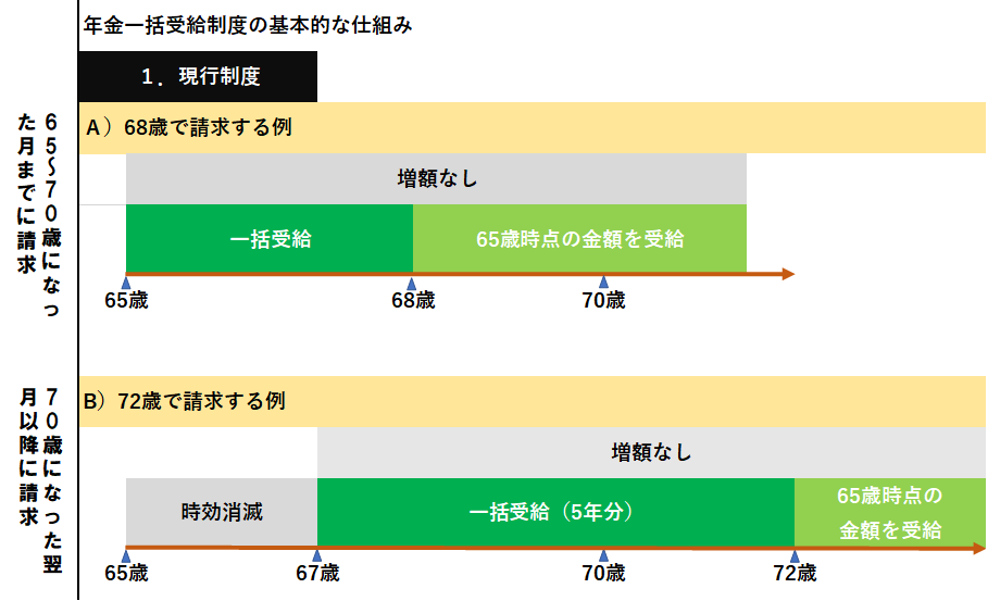 一括受給の場合、年金の時効は最大5年分なので、増額なしの5年分を一括で受け取ります。ただし、65歳からの2年分は時効消滅するため、注意が必要です。(図1のB)