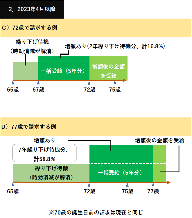 大きな変更は一括受給です。23年4月から仕組みが図2のように変わります。70歳の誕生日から80歳の誕生日の前々日までの請求であれば、5年前に繰り下げ請求があったとみなします。例えば、72歳での請求(図2のC)なら、67歳で請求したとして65歳以降2年分の増額率16.8%を反映した金額を5年分一括でもらい、その後は同額を毎月受給する方式となります。一度に多くの資金が欲しい時の一括受給でも金額が増える点が現在と異なり、有利です。