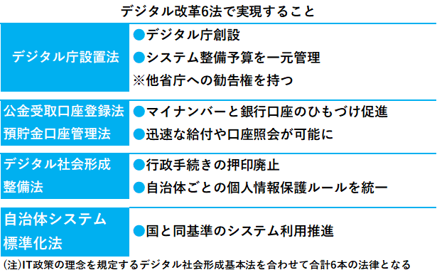 菅政権の看板政策「行政のデジタル化」を推進する関連6法が12日、成立しました。公的な給付金の円滑な受け取りや行政手続きの押印廃止につながります。政府と地方のシステムは5年かけて統一されるようです。新型コロナウイルス対応でデジタル化の遅れが顕在化した日本ですが、デジタル庁の設置を機に立て直しを図っていきます。