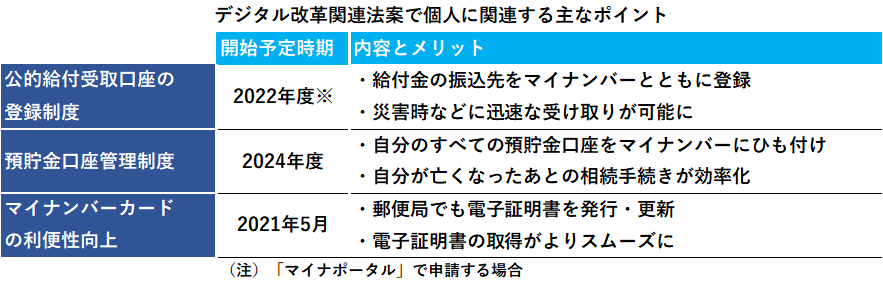 個人にとっては預貯金口座の管理制度も大きいです。自分のすべての預貯金口座とマイナンバーを連携させる仕組みで、2024年度の開始を目指します。メリットの一つが相続手続きの効率化です。相続では相続人が故人の財産すべてを分ける必要がありますが、財産の内容を遺言などで明記しているケースは少ないのが現実です。亡くなった親の口座がないかどうか心当たりの金融機関ひとつひとつに子供が確認する例も多くあります。