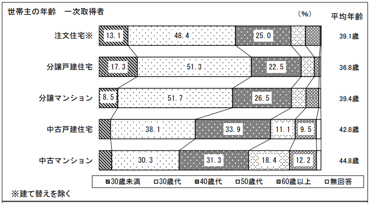 国土交通省の住宅市場動向調査によれば、注文住宅や分譲マンションを初めて購入した世帯主の平均年齢はここ数年、40歳前後で推移します。12年度は37歳~38歳だったのに比べ2~3歳ほど上昇しました。