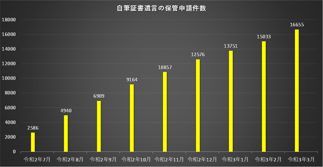保管制度は2020年7月に始まりました。自分で作成した遺言書を法務局に持参すると保管してもらえます。従来の制度に比べ費用や手間の負担が少なく、自分で遺言を作るハードルが低くなりました。保管申請数は増加傾向で、法務省によると21年3月までの累計で約1万6700件となっています。