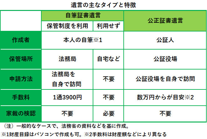 遺言には大きく分けて「自筆証書遺言」と公証人が内容を聞き取るなどして作る「公正証書遺言」の2つがあります。自筆証書遺言は本人が全文を手書きします。書く内容を司法書士などに相談しなければ費用はかかりませんが、内容と書式に誤りや不備があると無効になったり、遺産争いに繋がったりしやすくなります。自宅で保管するなら紛失や改ざんのリスクがあります。遺言を開封する際は家庭裁判所で裁判官が立ち会う「検認」という手続きも必要です。