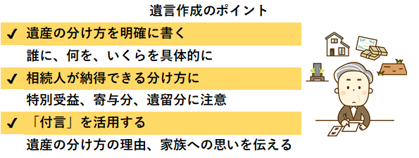 遺言書本文に書き添える「付言事項」も活用したいところです。遺産の分けの理由や家族への感謝などを伝えたりすることで、相続人が遺言書の内容に納得することが期待できます。