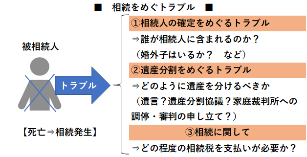 相続に関しては、さまざまなトラブルの発生が考えられますが、次の3点に分類することができます。