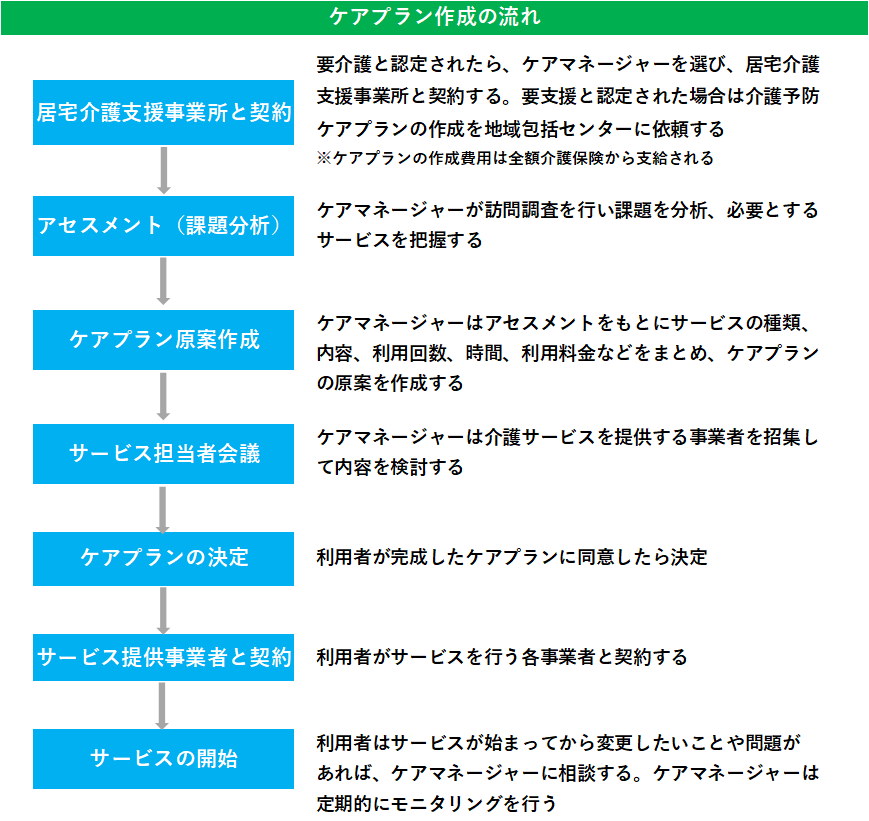 要介護者のケアプランは、介護支援サービスを提供する機関である「居宅介護支援事業所」のケアマネージャー(介護支援専門員)が作成します。