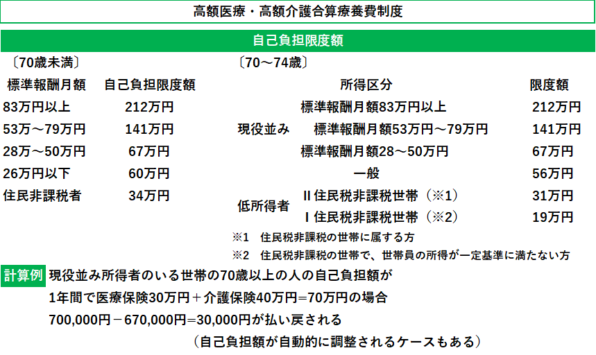 また、「高額医療・高額介護合算療養制度」では、医療費の自己負担額と介護サービスの利用者負担額の合計が1年間(毎年8月から翌年7月まで)で限度額を超えた場合、申請すると超えた額が払い戻されます。高齢者のいる世帯では医療費と介護費の出費が重なって家計を圧迫することになるので、ぜひ知っておきたい制度です。