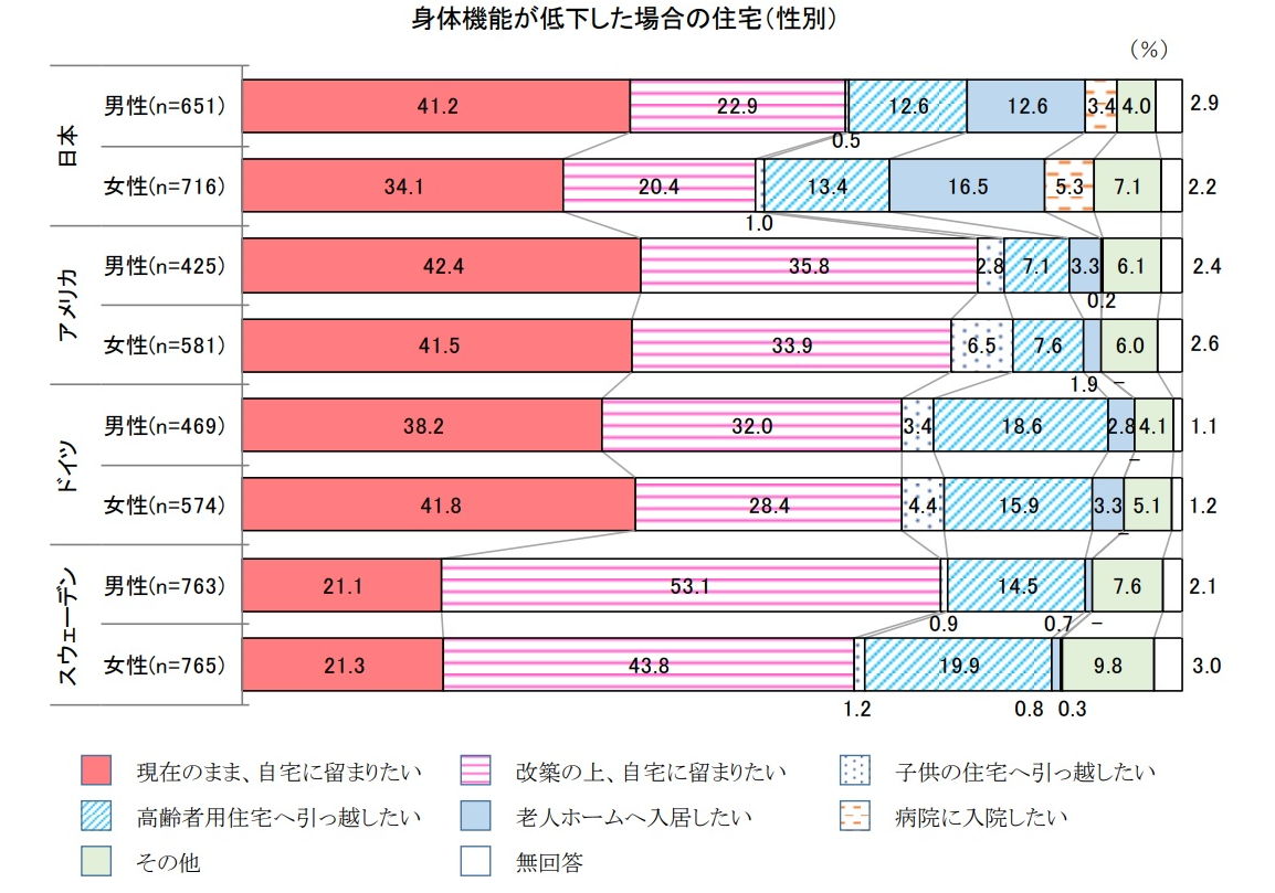 内閣府の2018年の調査によると、老後の身体機能が低下してからの住まいについて、日本人の30~40%近くは「現在のまま、自宅に留まりたい」と答えています。
