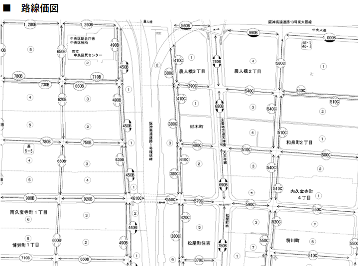 他に、路線価が丸やひし形の記号の中に書かれている箇所がありますが、この記号は「地区区分」を表し、繁華街地区や普通地区など7つに区分されています。路線価方式の計算では、土地の形状や道路への接面状況などに応じて評価額の修正を行うことがありますが、その際にこの地区区分の判定が必要になります。