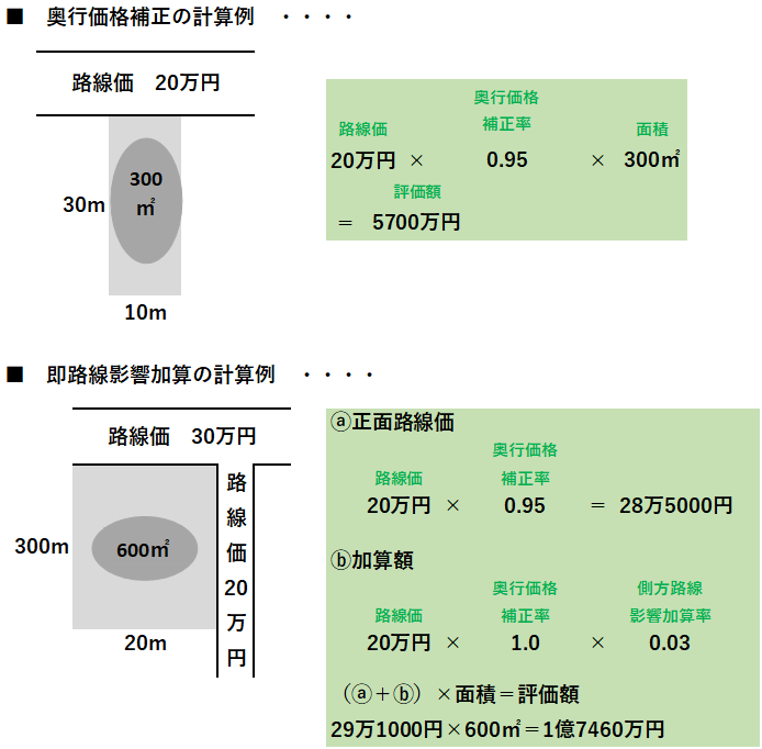 土地の評価額=路線価×奥行価格補正率×面積