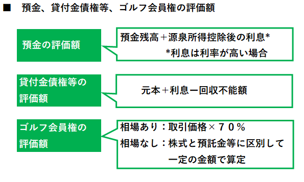 預金(貯金)などの金銭債権の評価方法については、預金と貸付金債権等によって異なります。