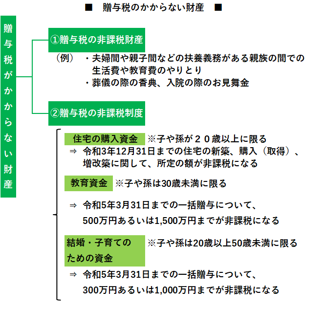贈与税のかからない財産には、①「贈与税の非課税財産」に該当する財産と、②「贈与税の非課税制度」に該当する財産があります。