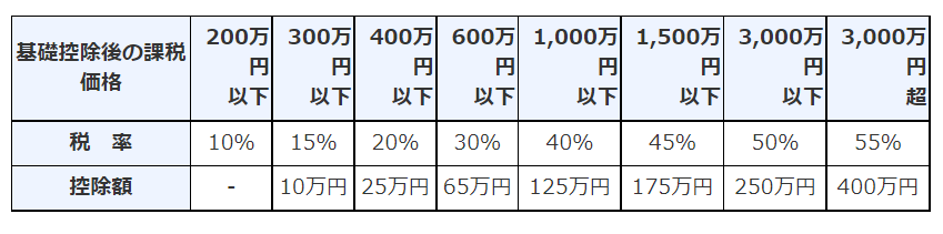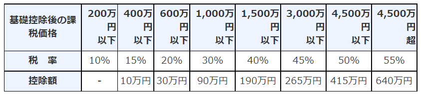 贈与税の速算表により、基礎控除後の財産に対して、該当する税率を乗じて、控除額を差し引きする。
