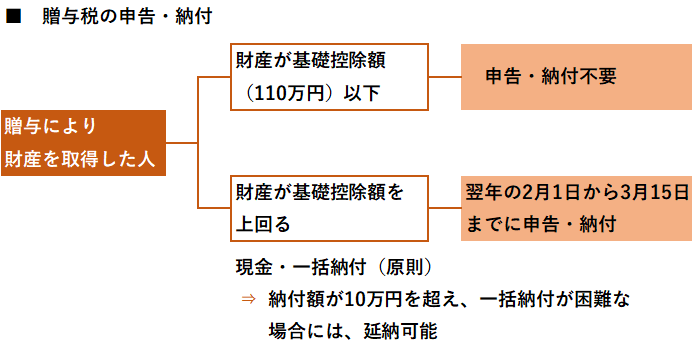 贈与税は、原則として1年間(1月1日から12月31日の間)に贈与を受けた財産を対象に課税されます。もっとも、贈与税には基礎控除額として年間110万円の控除が認められていますので、110万円を超える財産の贈与を受けた場合に、はじめて贈与税の申告・納付の対象になります。110万円以下の財産の贈与を受けた人については、申告・納付の必要はありません。