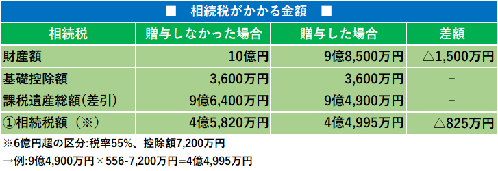 財産が10億円、相続人が20歳以上の子供1人の前提で、1,500万円の贈与を1回だけ行った場合の節税効果を確認してみます。