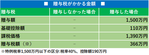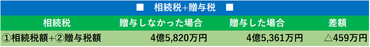 このケースでは、1,500万円の贈与によって贈与税が366万円かかりますが、相続税は825万円減るため、贈与税と相続税のトータルで見た場合には459万円の節税効果を得られました。