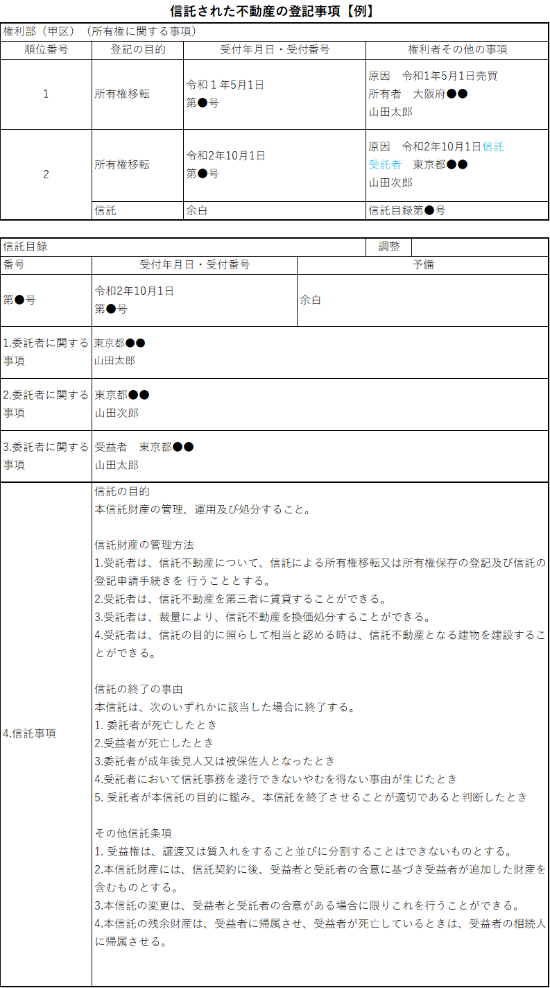 不動産を信託すると、委託者から受託者へ所有権が移転しますので、対象不動産の所有権移転登記をする必要があります。この登記をすることで、登記簿上は受託者が所有権者という形で登記され、形式的な所有者として扱われます。通常の所有権移転ではなく、信託による所有権移転となり、信託目録も同時に登記されますので、信託不動産かどうかは登記事項証明書を取得することで確認できます。