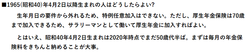 こちらの任意加入は特例制度なので、年金額を増やす目的での加入はできません。期間が足りない場合にのみ加入できます。また、1965(昭和40)年4月1日以前に生まれた人が対象です。