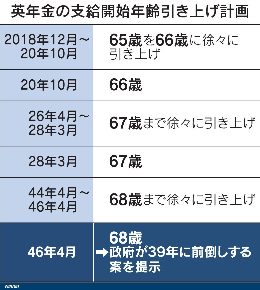 今後はまず、26年~28年にかけて67歳に引き上げます。17年には68歳への引き上げを当初案の46年ではなく、39年に7年前倒しする案が示されました。これも来年に迫る6年に1回の制度見直しで正式に決まる可能性があります。