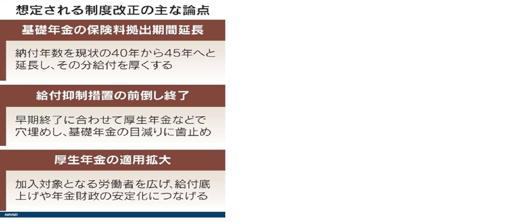もう一つは40年(20歳~59歳)となっている基礎年金の加入期間を45年(20歳~64歳)に延長する案だ。自営業者ら多くの加入者にとって負担増となり、広く理解を求める必要がある。