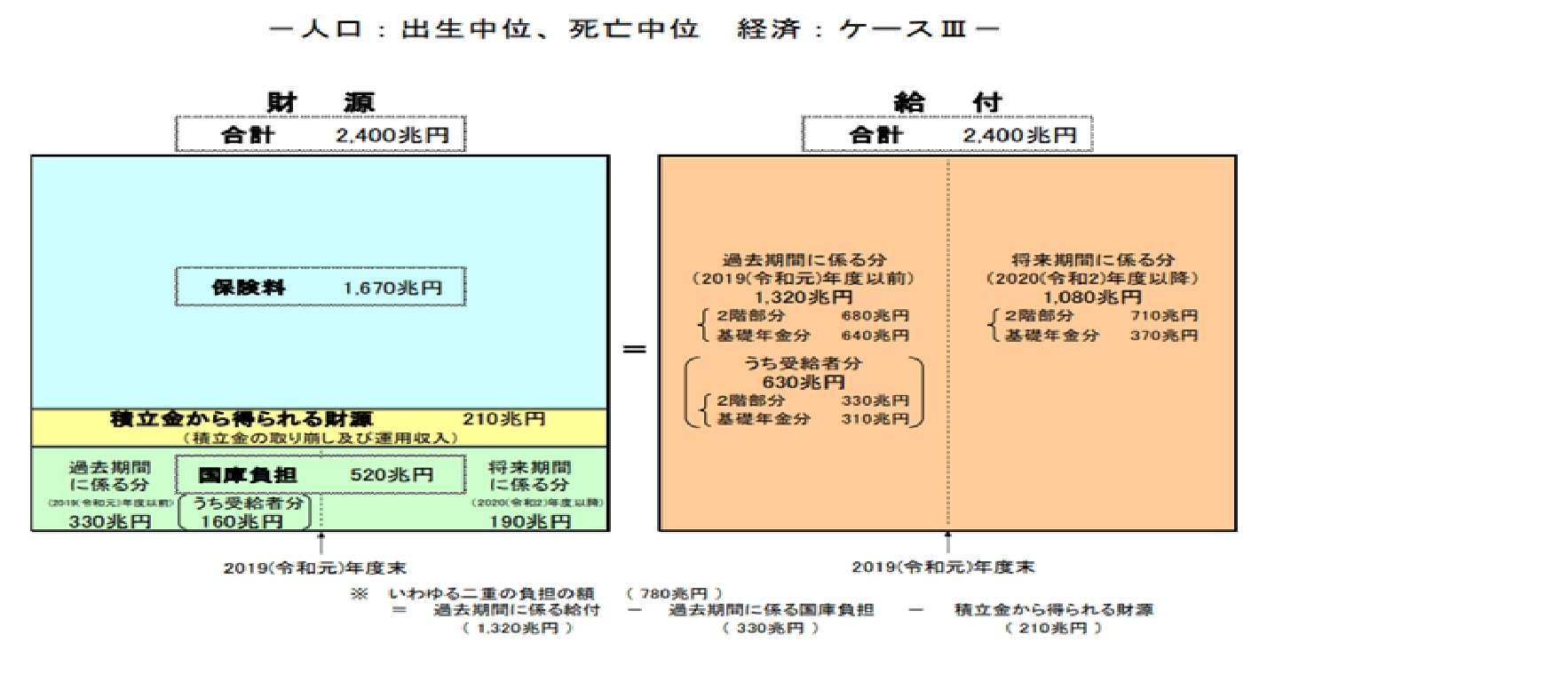 =保険料(1,670兆円)+国庫負担(520兆円)-将来債務(1,080兆円)