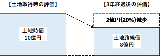 図のように、土地を取得した際の時価が10億円だったとします。これに対して、路線価は概ね時価の80%と考えられており、3年経過後は、10億円の20%である2億円が減少し、8億円の評価額になります。