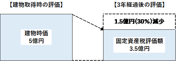 次に建物ですが、建物の固定資産税価額は概ね時価の60%から70%と言われており、仮に70%とすると建物の取得から3年経過後は、5億円の30%である1.5億円が減少し3.5億円の評価額になります。