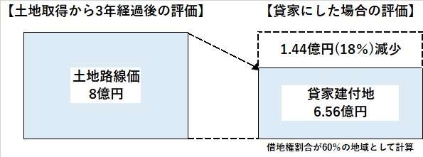 つまり、不動産を賃貸にすることで、1.44億円(18%)の評価減を得られたということです。