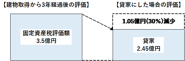 図の左側は、建物取得から3年経過後に、建物の固定資産税評価額が3.5億円という状況です。