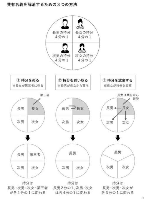 共有名義を解消する方法としては、次の図のように「自己の持分を売る」「他の持分を買い取る」「自己の持分を放棄する」の3つがあります。この中から状況に応じて最適な方法を選択することになります。ここでは、長男・長女・次男・次女の4人がそれぞれ4分の1の持分で共有状態になっている事例で考えてみます。