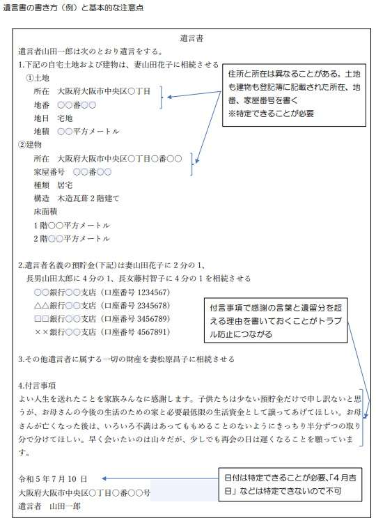 遺言書の書き方の例と基本的な注意点は、次の図のようになりますが、作成方法と押さえるべきポイントは次の5つになります。