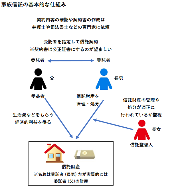 例えば、父親の介護施設への入所資金にあてるために自宅を売却したりすることが可能です。なお、長男だけに信託財産管理を任せることに不安がある場合は、他の家族(長女など)を信託監督人にして適正な管理をチェックすることもできます。