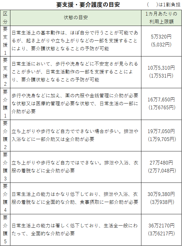 要介護度は、次ページの図のような身体の状態が目安になり、1カ月あたりの利用限度額は大きく変わってきます。