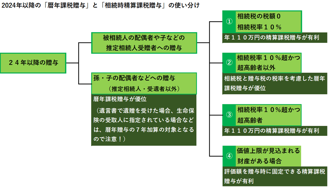すなわち、相続時精算課税贈与はその制度上、そもそも相続財産が相続税の基礎控除額(3000万円+法定相続人の数×600万円)内に収まって相続税がかからない人には有利で、相続税率が10%の場合も生前贈与加算7年延長を踏まえれば有利となります。また、近い将来、相続発生が心配される人も、年110万円の贈与であれば、相続時精算課税が有利となります。