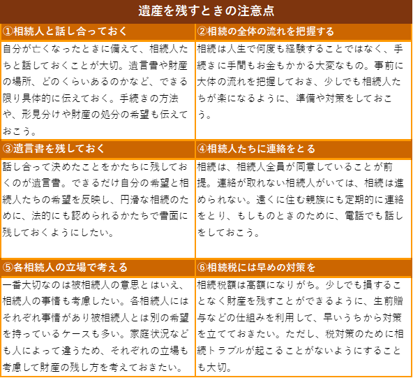 また、資産が少ない人ほど、自分には関係ないと考えて対策を怠る傾向にあるようです。これもトラブル増加の要因になっていると考えられます。まずは「自分には関係ない」という思い込みを捨て、確認と準備をしましょう。「争続」を避けるためのポイントは次の6つです。
