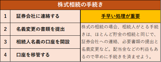 まず証券会社へ連絡し、名義人が亡くなったことを知らせます。すると名義変更に必要な書類と案内を送付してくれるので、その案内に従って書類を準備し、申請します。もし被相続人の口座がある証券会社などに相続人名義の口座があれば、すぐにも書き換えが可能。そうでない場合は新規での口座かいったん解約となります。