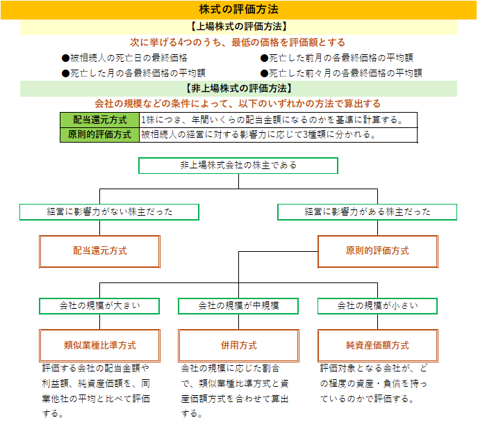上場企業に対して非上場企業は株が公開されていません。この場合、株式の評価は、原則的評価方式と配還元方式とよばれるふたつの評価方法で計算されます。