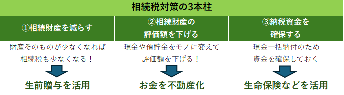 ただし被相続人が亡くなると、その時点での対策は不可能になってしまいます。つまり、相続税を減らしたいなら、被相続人が亡くなる前に、相続財産について見通しを立て、被相続人と相続人とで相談し、対策を講じておかなければなりません。重要な対策法は、①相続財産を減らず、②相続財産の評価額を下げる、③納税資金を確保する、の3つです。