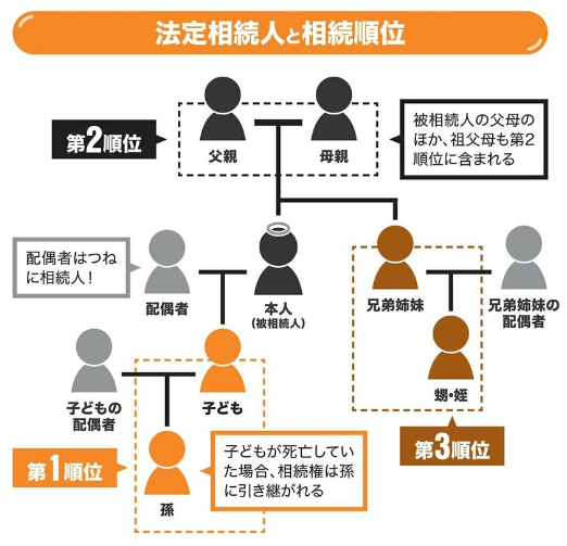 法定相続人の第1順位は、被相続人の直系卑属、つまり子どもたちです。子どもがいなければ第2順位被相続人の直系尊属である父母、または祖父母。それにも該当する人がいなかった場合は第3順位の傍系にあたる、兄弟姉妹になります。