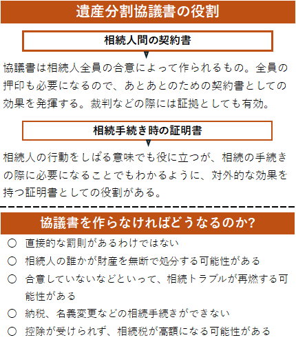 この協議書には、契約書としての役割と、証明書としての役割があります。相続人全員の間で、遺産をこのように分けると契約したという記になるため、相続人が不当に財産を処分することができなくなるのです。また、その内容に全員が同意し、そのかたちで分割されたことが証明されるため、財産の引き継ぎの手続きでもこの書類に効果があります。