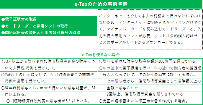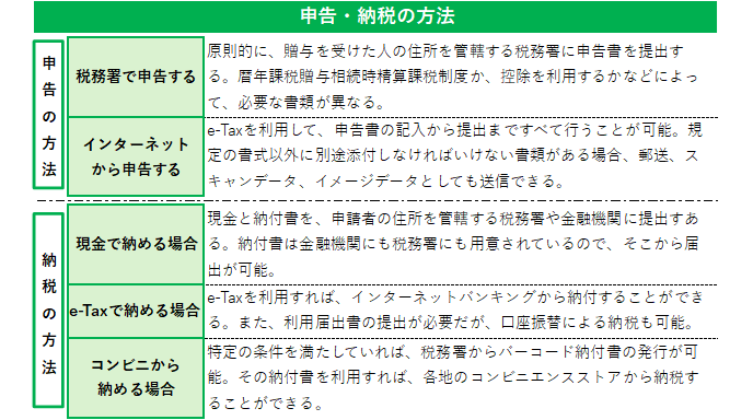 贈与税の申告は、書面による手続きだけではなく、「e‐Tax」という国税庁運営のホームページからも申請できます。このサイトを利用すれば、インターネットバンキングや登録した口座からの振替による納税手続きを行えます。