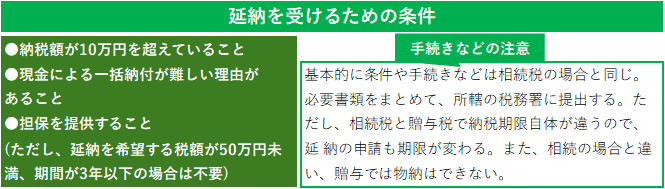 ちなみに、贈与税はほかの税金と同様、現金一括納付が基本です。ただし、相続税と同じで、金額が大きくなる場合もあるので、延納(分割での納付)も選択可能です。物納ができないこと以外、各種条件や手続きは、相続税の納付と同様です。