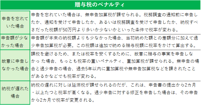 また、もしも申告した金額が、実際に贈与された金額よりも少なかった場合や、期限までに申告できなかったときには、過少申告加算税や無申告加算税とよばれる税金が課されてしまいます。