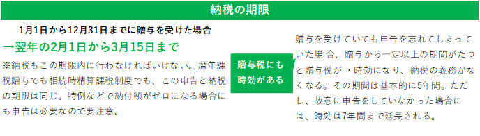 贈与税は、財産を贈与された年の翌年の2月1日から3月15日までの間に申告と納税を行うことになっています。相続税のように、贈与を受けたときから一定期間という条件とは異なる点に注意です。